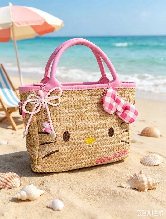 Hello Kitty Straw Tote Bag with Pink Bow Summer Beach Crossbody Handbag