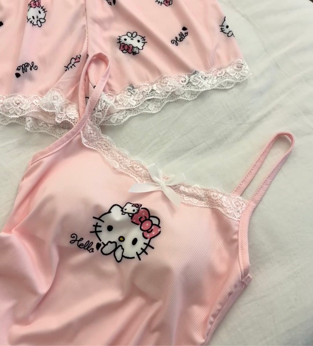Embrace your inner cutie with this irresistible Hello Kitty set! 💖 The delicate pink lace bralette and matching shorts blend adorable style with cloud-soft comfort. Perfect for lazy mornings, cozy nights in, or feeling secretly chic under your clothes. It’s more than loungewear—it’s a daily dose of joy and confidence, wrapped up with everyone’s favorite kitty! 🎀🛋️✨